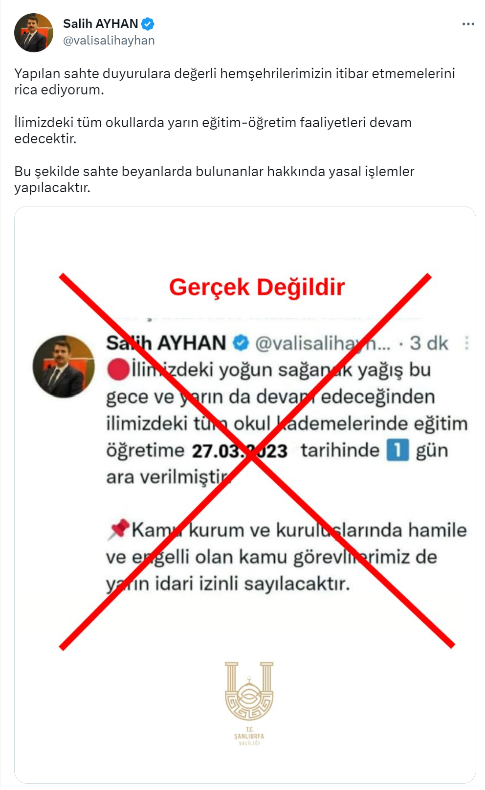 “Yapılan sahte duyurulara değerli hemşehrilerimizin itibar etmemelerini rica ediyorum. İlimizdeki tüm okullarda yarın eğitim-öğretim faaliyetleri devam edecektir. Bu şekilde sahte beyanlarda bulunanlar hakkında yasal işlemler yapılacaktır.”