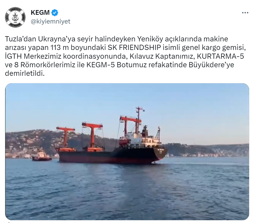 Kıyı Emniyeti Genel Müdürlüğü’nden yapılan açıklamada, “Tuzla’dan Ukrayna’ya seyir halindeyken Yeniköy açıklarında makine arızası yapan 113 m boyundaki SK FRIENDSHIP isimli genel kargo gemisi, İGTH Merkezimiz koordinasyonunda, Kılavuz Kaptanımız, KURTARMA-5 ve 8 Römorkörlerimiz ile KEGM-5 Botumuz refakatinde Büyükdere’ye demirletildi.” denildi.