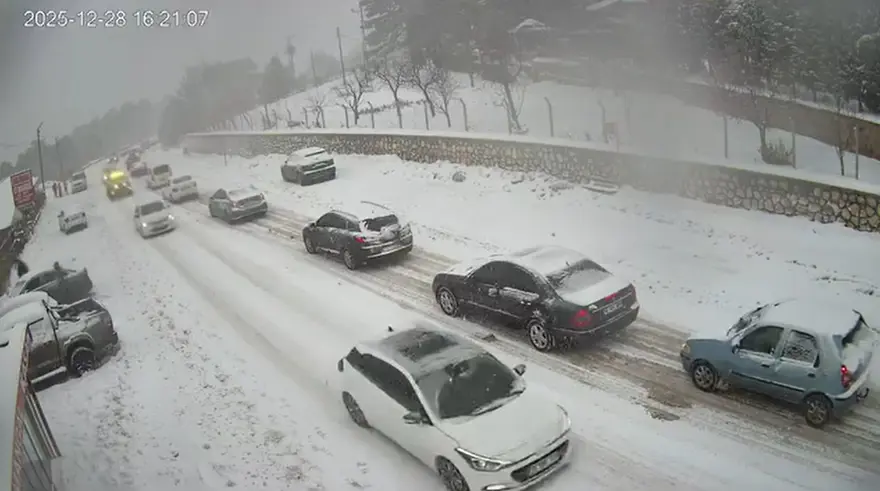 Bursa Uludağ’da öğleden sonra etkisini artıran kar yağışıyla birlikte, yolda da trafik yoğunlaştı. Dönüşe geçen günübirlik tatilcileri taşıyan otomobillerle, tur otobüsleri Uludağ’da dönüş yolunda metrelerce kuyruk oluşturdu. Karla kaplı yollarda adım adım ilerleyen araçlar, çevredeki iş yerlerinin güvenlik kamerasına yansıdı.